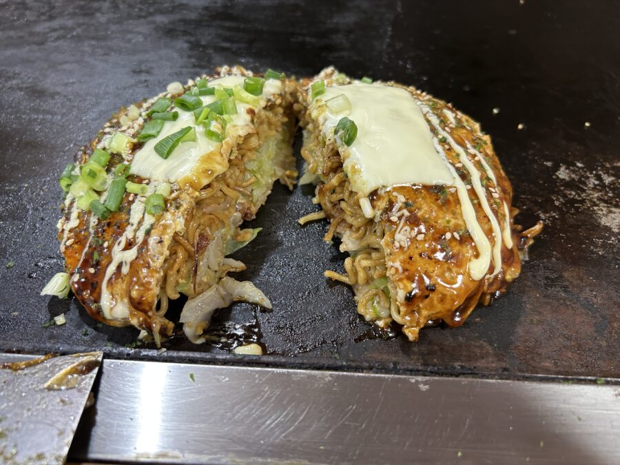 広島お好み焼きのそば入り、チーズとネギトッピングです。