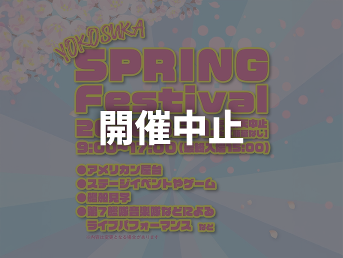 3月21日(土)に開催予定の「日米親善よこすかスプリングフェスタ2026」は、米海軍横須賀基地司令部から、現在の国際情勢を踏まえ、開催が困難であるとの連絡がありましたので、本イベントの開催を中止することとなりました。