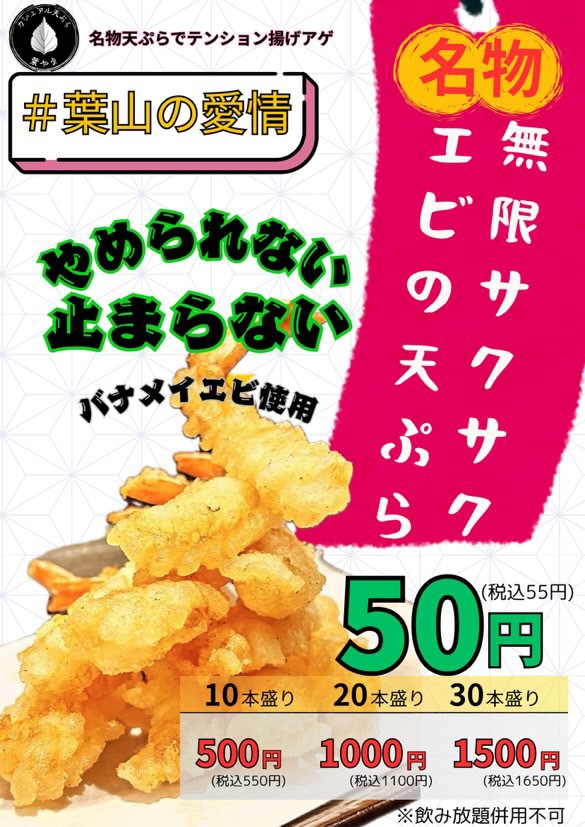 なんと、エビ天1本50円というサービスも!エビ天を10本注文したお客様もいらっしゃったとか。